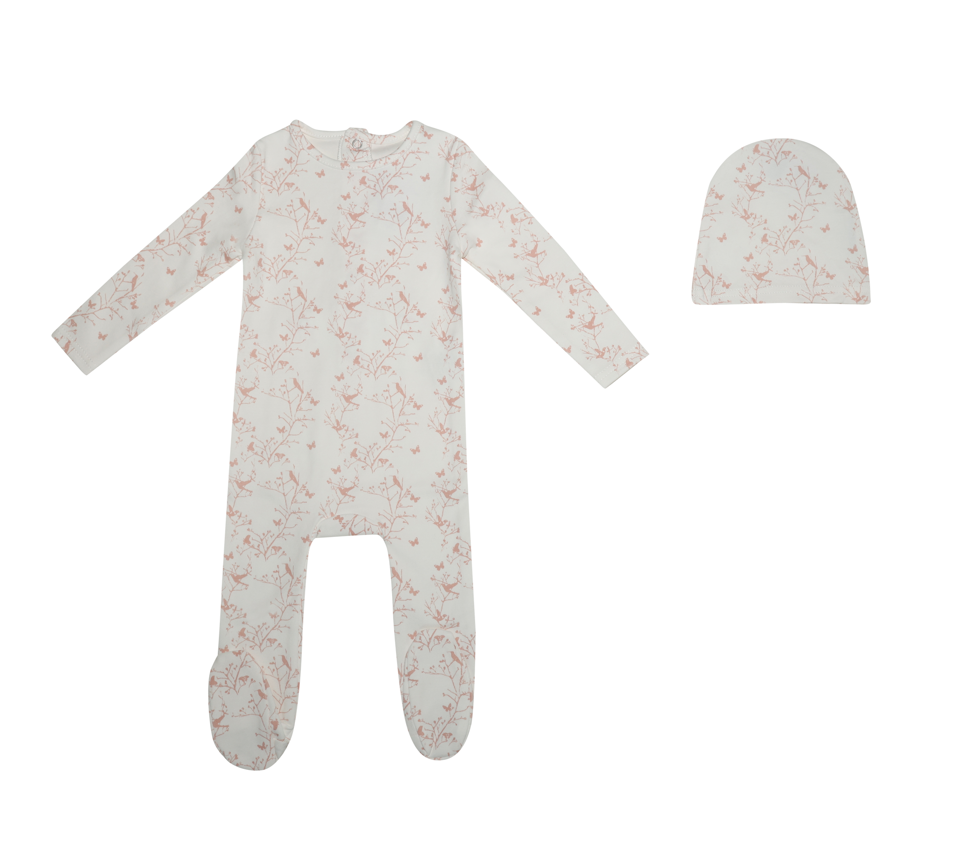 Pima Cotton Printed Bird Footie and Hat - Pink